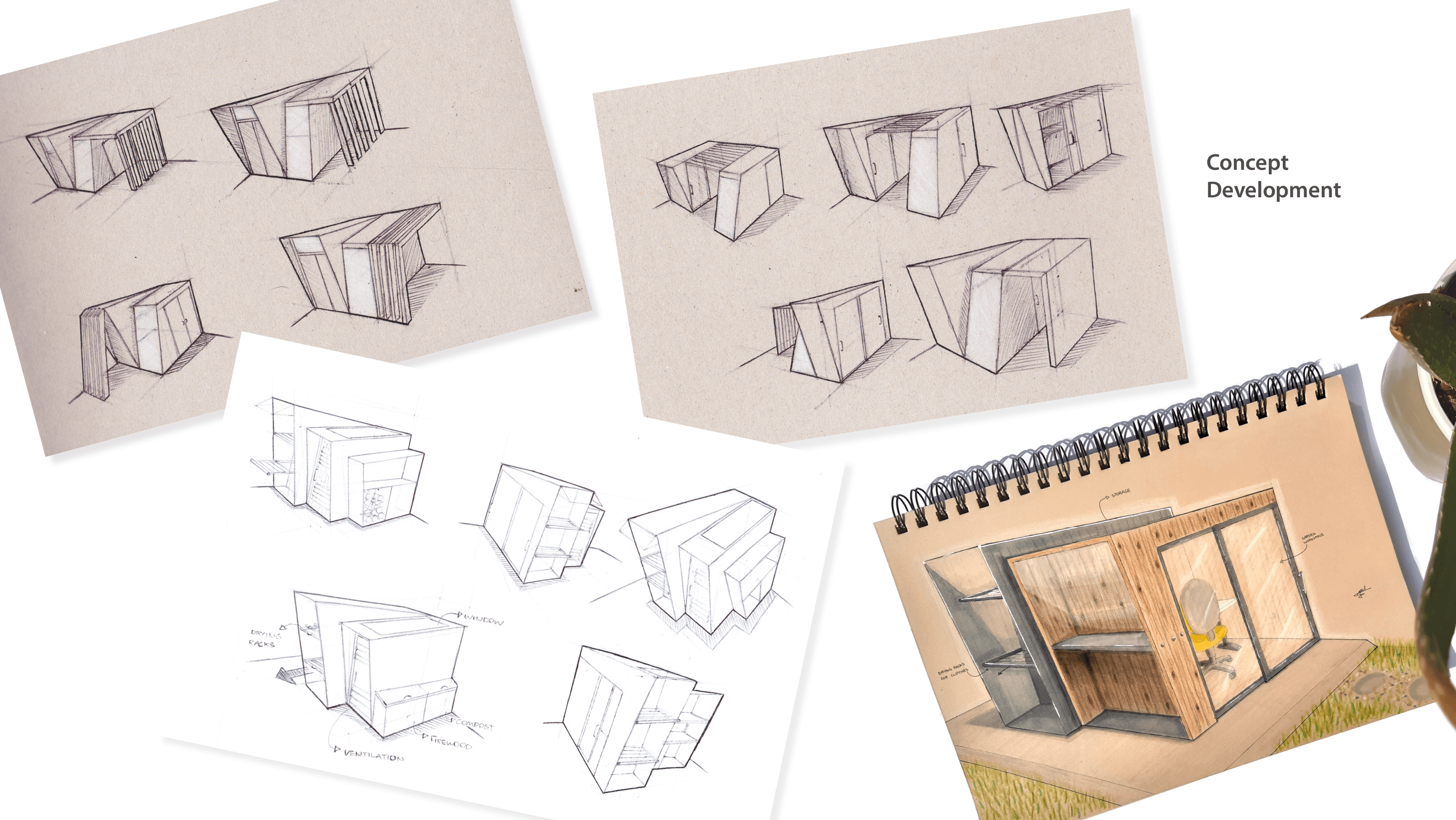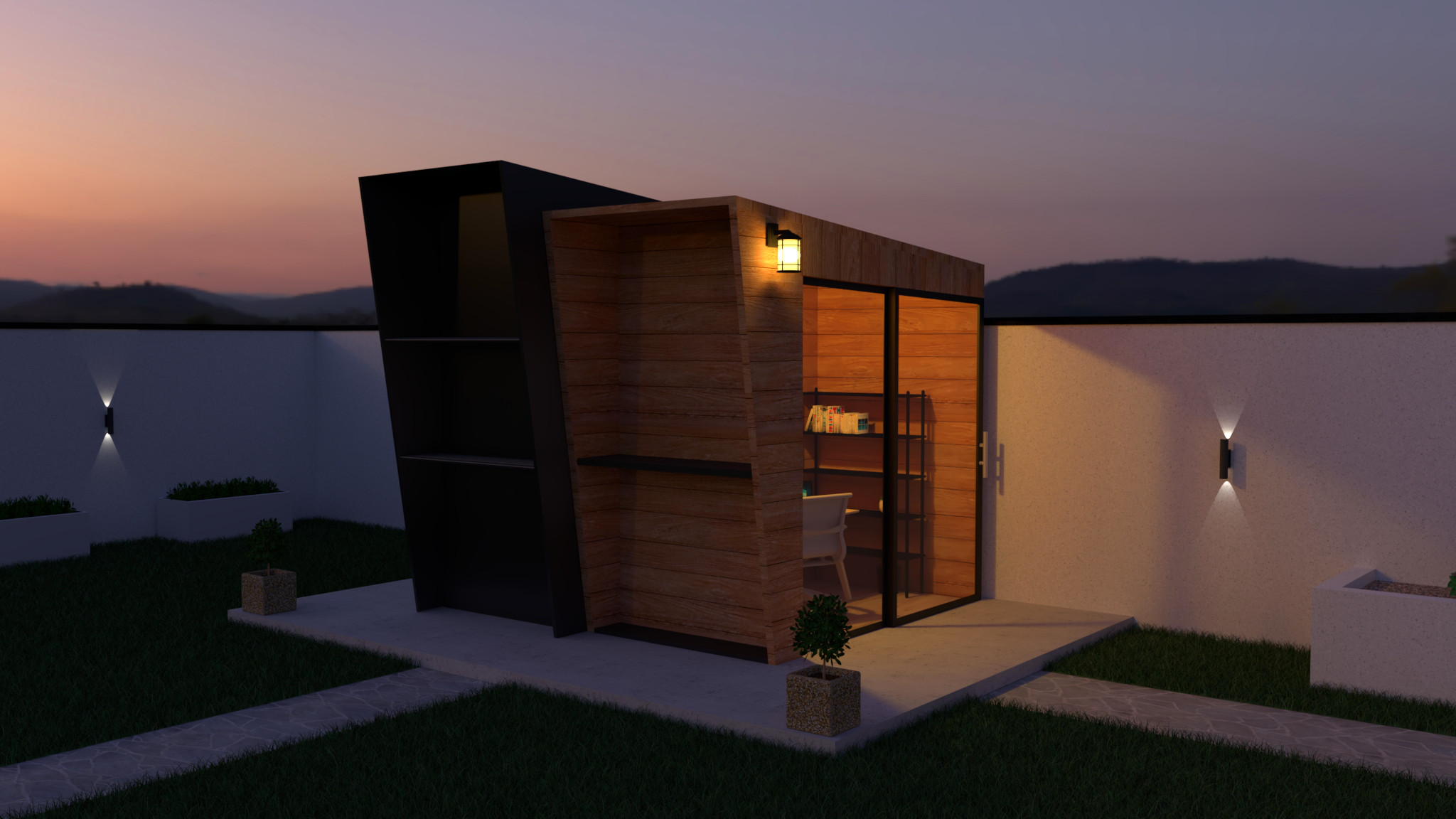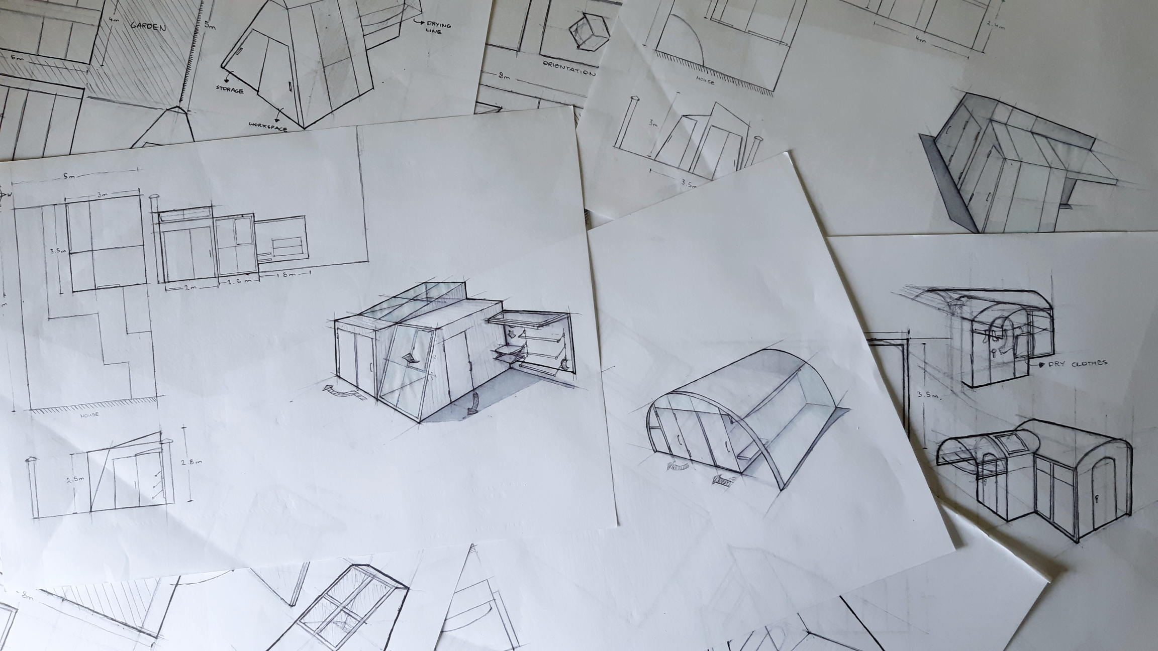 Design a structure, situated in a back garden, that facilitates a family's requirement for a small workspace, a fresh-air laundry drying area and storage.